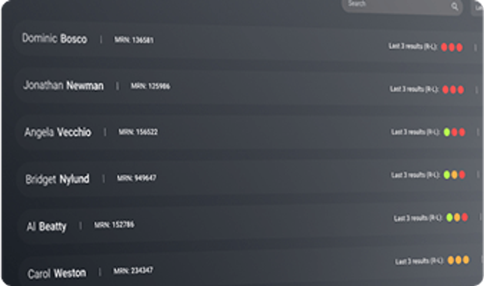 Trend plots and traffic-light alerts surface only the patients who need attention.